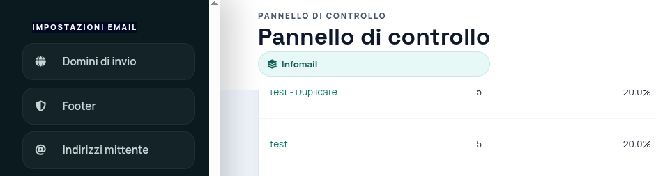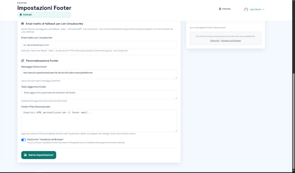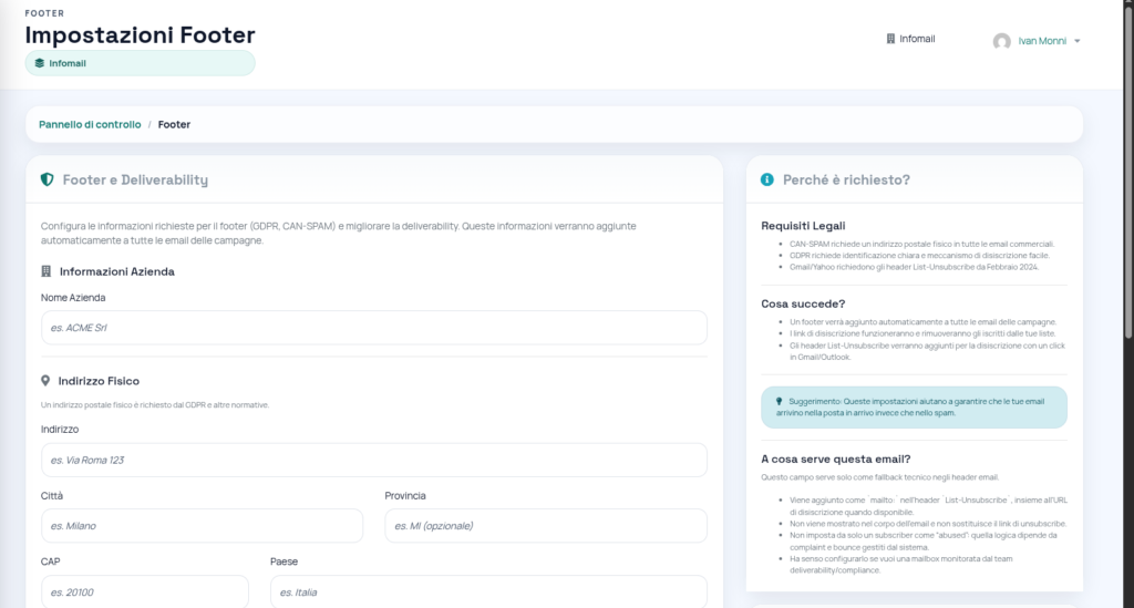 In questa sezione dovrai inserire i tuoi dati aziendali obbligatori ai fini del GDPR. Il footer verrà quindi aggiunto automaticamente a ogni invio.